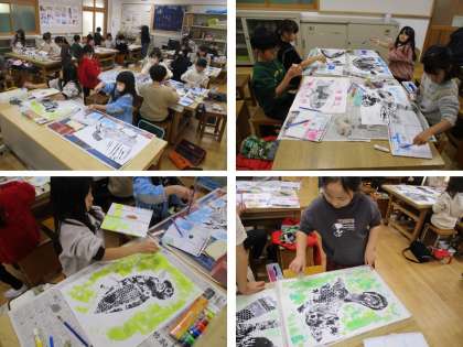 つくった版にインクをつけて和紙に刷り、絵の具で色をつけています。