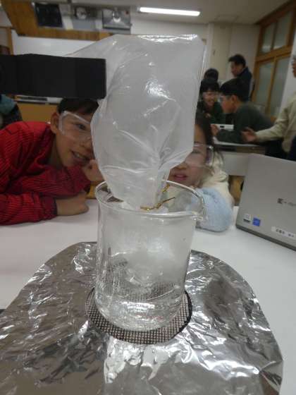 ビーカーの中でふっとうしている水から出てくるあわをろうとと、ポリ袋を使って集めました。