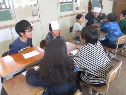 国語科では、「ひみつの言葉を引き出そう」という学習をしました。気持ちや様子を表す言葉が書かれているカードを自分には見えないように持ち、周りの班の子がその言葉を引き出すように話をしました。周りの子たちは「気の毒」や「後ろめたい」などの引き出すことが難しい言葉でも「どうしようかな。」「どんな話をするといいかな。」と悩みながら頑張って引き出せるように話題を変えながら話しかけていました。