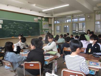今日から外国語の学習が始まりました。はじめは「どうして外国語を学ぶのか」をテーマにみんなで話し合って考えました。「AIがあるのに学ぶ必要はあるのかな」「将来外国語を使う仕事につかなくても必要かな」など悩みながら、「AIでは気持ちが伝わらないから学ぶ。」「旅行など楽しんだり、困っている外国の人を助けたりしたいから学ぶ。」と子どもたちなりに考えていました。