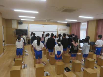 6年生の音楽の学習が始まりました。今年度も引き続き黒柳先生に教えていただきます。ホワイトボードに貼ってあるにこちゃんマークのように、いい笑顔で歌って、音楽を楽しんでほしいと思います。