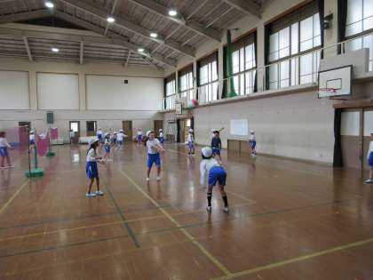 まずはルール、コートの準備の仕方、トスのやり方について知り、チームでボールをつなぐ活動をしました。