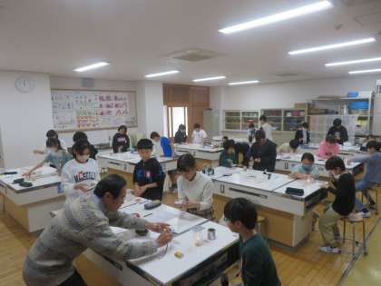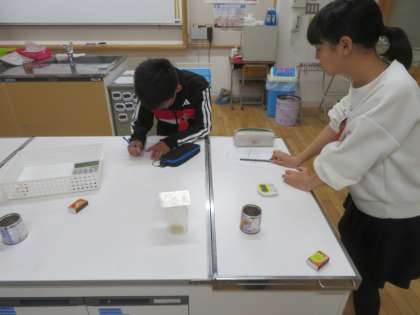 理科の学習では、ものの燃え方の学習を進めています。ろうそくに火をつけて瓶をかぶせると火が消えることから、条件を制御をして、その理由を探っています。
