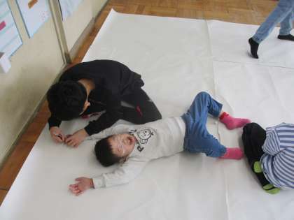 図画工作の時間に、自分の体の線を模造紙に描きました。いろんなポーズを考えてから、模造紙に寝て、鉛筆で線を引きました。終わってからも、「もう1回やりたいです!」とみんなが言っていました。模造紙にえがいた自分の姿を見てみんな笑顔になりました。