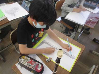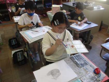 図画工作科の学習では、自分の大切にしているものをスケッチしました。目で見て、手で触って様々な視点から物の形をとらえ、光と影のバランスを意識しながら、スケッチしました。「一番明るいところ」「二番目に明るいところ」「一番暗いところ」と見極めながら、影を塗り重ねていきました。授業参観の際に教室に掲示していますので、ご覧ください。
