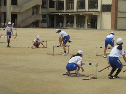 体育の学習でハードル走に挑戦しています。自分の歩幅にあった距離を見つけるために、1時間目はたくさん走りました。初めての準備だったため、時間はかかっていましたが、協力して準備片づけを進めていました。