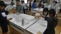 二酸化炭素で満たした広口びんの中に、火のついたろうそくをいれて、炎の様子を観察します。