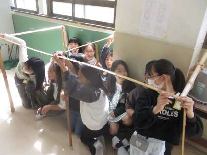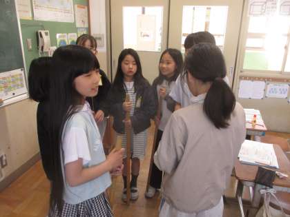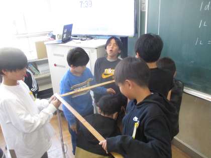 算数科では、「体積」の学習を進めています。今日は1mものさしを使って、身の回りの体積や容積をはかったり、実際に直方体を作ってそこに何人入れるか確かめたりしました。「給食台って意外と大きいな。」「2㎥の中にたくさん人が入るな。」など言いながら、子どもたちは楽しんで学習をしていました。
