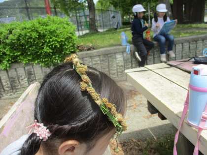途中公園で休憩すると,ベンチにお花の冠が!!頭に乗せたくなるくらいうれしい時間だったようです。