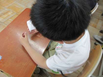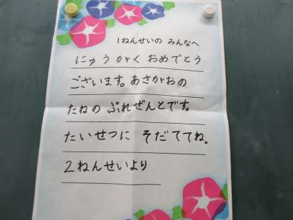 入学した時からずっと教室に謎の封筒がありました。開けてみると、2年生からのアサガオの種のプレゼントでした。みんな大喜び!大切に育てていこうと思います。