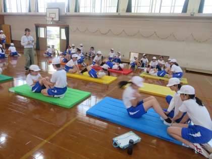 上体起こしでは、お互いに足をおさえ合って、記録を取りました。「去年よりも回数が増えたよ!」と喜んでいる声が聞こえてきました。