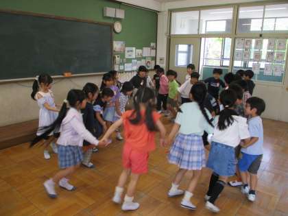 音楽の学習では、リズムに合わせて身体を動かしたり歌ったりしています。
