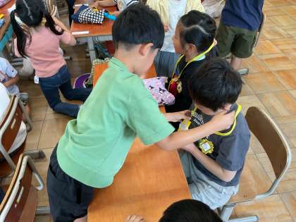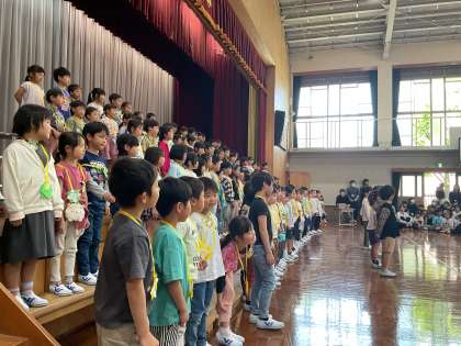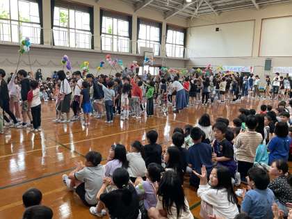 1年生を迎える会がありました。2年生が1年生のために作ってくれたメダルをかけて入場しました。6年生と手を繋ぎ、緊張した様子でした。2年生から6年生が学校のことをクイズや歌などで教えてもらい、たくさんの笑顔が見られました。