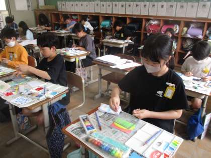 図画工作の学習では、「心のもよう」の学習をしました。コンテを削ったり、絵の具で塗ったり、ローラーをしたり、スパッタリングの技法を使ったりといろいろな技法で自分の気持ちを色や形に表しました。
