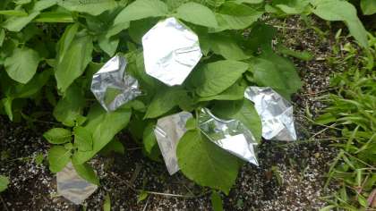 今回は、その前半です。学校園で育てているジャガイモの葉をアルミニウム箔でおおい、日光が当たらない葉を作りました。