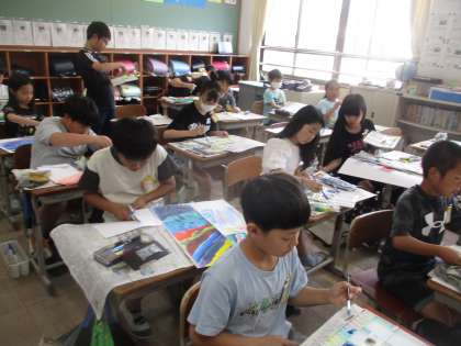 図画工作の学習では、「心のもよう」の学習をしました。前回いろいろな技法で自分の気持ちを色や形に表したものを大きな画用紙に貼り合わせて、自分の心を表しました。自分が書き表したものの理由とともに休日参観の際に教室に掲示していますので、ぜひご覧ください。