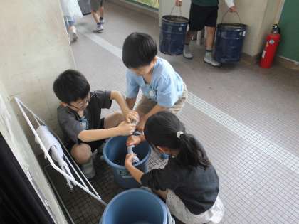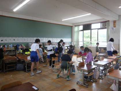 6年生に手伝ってもらいながら掃除も頑張っています。