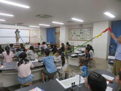 理科の学習では、人体の仕組みについて学習しています。もし、小腸や大腸などの臓器を体から引っ張り出した場合、写真のような長さだそうで、子どもたちも驚いていました。