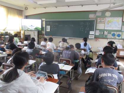社会科では、「あたたかい土地のくらし」で沖縄県のことを調べています。「沖縄県の地形や気候を住んでいる人々がくらしや産業にどのように生かしているのか」を資料などから読み取って学習をしています。「1年間温かいから...」「台風がたくさん来るから...」「山や川が少ないから...」と考えながらそこで暮らす秘密やそこで育つ作物の秘密を探りました。