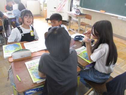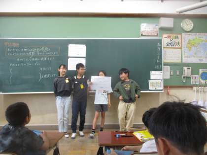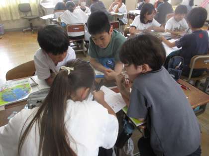 社会科では「あたたかい土地のくらし」の学習を進めています。沖縄の地形や気候をどのようにくらしや産業に生かしているのかを資料や写真から考えました。そこから沖縄県の市役所の地域振興課になりきって地形や気候を生かした取り組みは何ができるかをクラスに提案しました。「あたたかい気候を生かして道路をプールにすることを提案します」「台風が多く来る気候を生かして風力発電を提案します」とグループで練った提案をしていました。