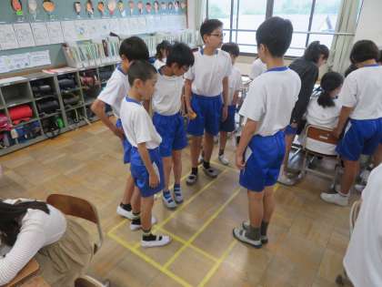 分数×分数をどうやって計算するのかについて、各自説明し合っている様子です。教室の床を使って説明していたので、マスキングテープを貼るとより分かりやすく説明することができました。