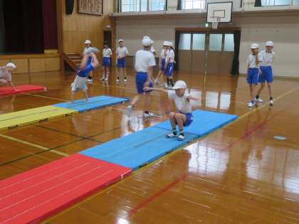 体育の学習で、マット運動の学習が始まりました。まずは去年までの間隔を思い出すために、様々な技に挑戦しました。