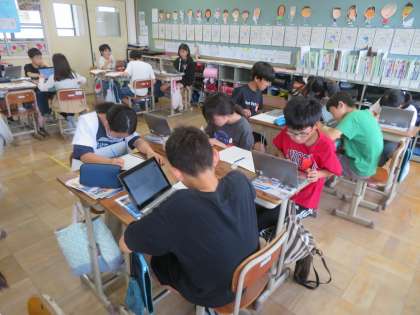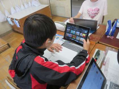 社会科「子育て支援の願いを実現する政治」の学習で、京都市にある「こどもみらい館」について調べています。利用したことのない人がいるようなので、今日は、こどもみらい館でどんなことができるのかについて、自分たちで調べました。インターネットを使って調べる人や、パンフレットを見る人、動画を見る人など、活動方法はさまざまでした。