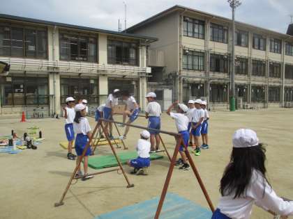 体育科では、「鉄棒運動」の学習を進めました。友だち同士で教え合いながら、前回り下りや逆上がりなどの技から、少し難しい前方支持回転や後方支持回転までたくさんの技に挑戦していました。「5年生になって初めて逆上がりができた。」「先生の前やとパワーが貰えたからかできた。」とできるようになった技があって喜んでいました。