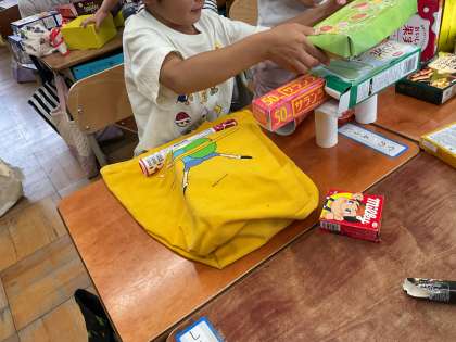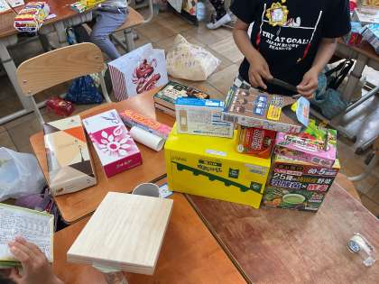 図画工作科で「はこでつくったよ」の学習をしました。算数科で学習した箱の形の特徴を生かして、動物や乗り物などをつくる姿が見られました。