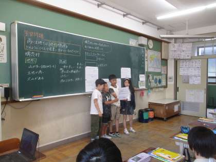 社会科では、「高い土地のくらし」の学習を進めました。学習の最後には、地域振興課の人になりきって、群馬県嬬恋村の高い土地の地形や気候を生かした取り組みを提案しました。火山を生かした温泉ツアーや温泉饅頭食べ比べ、山に囲まれている地形を生かした滑り台や温泉スライダーなど子どもたちなりに考えた面白い提案をしていました。