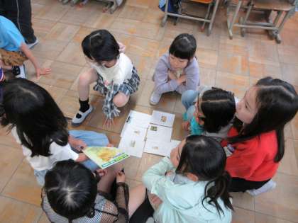 京都府と京都府に隣り合っている6府県のカードを持っている子たちが一人ずつ集まってグループを作り、実際の位置に合わせて並んでみました。