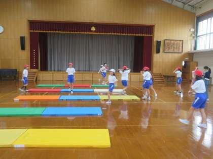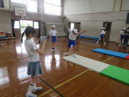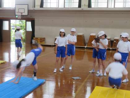 マット運動の学習では、タブレットを使ってお互いに動画を撮りながら、練習を進めています。