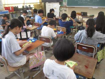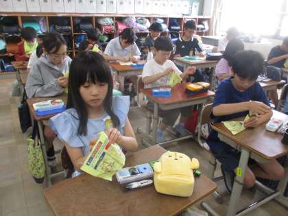家庭科では、「ひと針に心を込めて」の学習しました。今日は、ボタンを付ける練習をしました。二つ穴のボタン、四つ穴のボタン、足つきボタンとさまざまなボタンの付け方を学習し、自分たちで挑戦しました。少しずつできることが増えてきて、子どもたちはすごく喜んでいました。