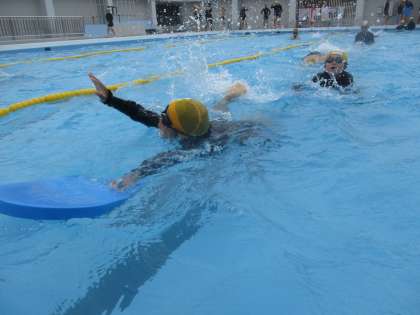体育科では、水泳学習が始まりました。今日は、自分の泳げる泳ぎで距離を目指して頑張りました。25m頑張るコース、50m以上を頑張るコース、先生とでも半分を目指して頑張るコースと自分のレベルに合わせて頑張っていました。