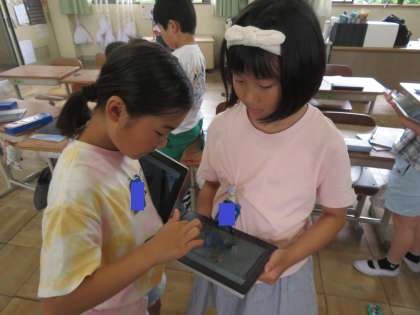 今回は、自分の文房具を写真に撮って「何本でしょう?クイズ」をつくり、友だちと交流しました。”nine!””seven!”と数を表す言い方を使って楽しむ様子が見られました。