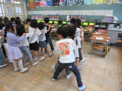 音楽科では拍を感じ取りながら楽しんで歌ったり、踊ったりしています。「しろくまのジェンガ」という曲では、みんなで拍を感じながらたのしくおどりました。