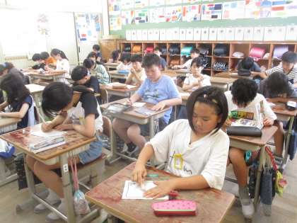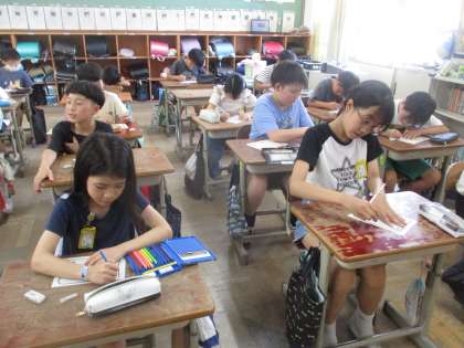 今日は、6組児童の紹介を聞きました。一人ひとりの好きな食べ物や好きなものを聞いたり、6組での授業の様子について知りました。紹介を聞いた後、子どもたちは「心がポカポカしたな。」「僕たちも頑張らないと。」と言っていました。最後に6組さんに向けて手紙を書きました。それぞれがおもいおもいに感じたことを手紙に書いていました。
