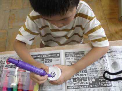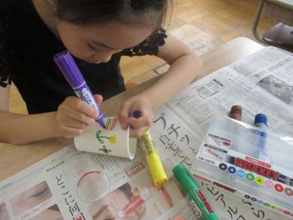 まず,紙コップに絵を描きました。みんな思い思いの絵を描き,お気に入りのコップを作りました。