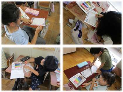 思い思いにメッセージを添えて、クーピーで色をつけています。