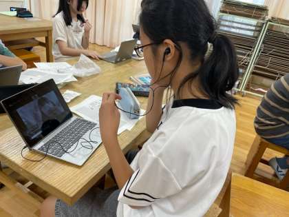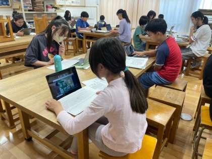 1日のスケジュールを、zoomで明徳小学校の6年生と交流しました。ジェスチャーを使ったり、質問したりしながら一生懸命交流していました。