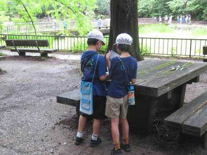 宝ヶ池公園に行き、生き物の写真を撮ったり、落ちている石や松ぼっくりを採取したりしました。どんよりとした天気だったため、鳥や鹿などは残念ながら見つけられませんでした。しかし、鯉やザリガニ、きのこなどたくさん見つかりました。