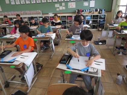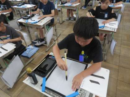 横画の筆使いに気を付けて、「二」という漢字を書きました。また、小筆を使って、自分の名前を書くことにも挑戦しました。