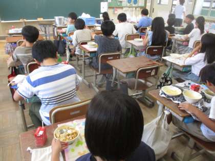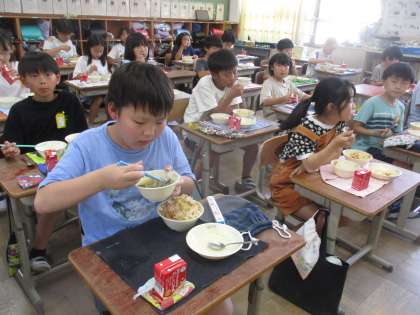 今日の給食は、新献立の「タコライス」がでました。タコライスは、沖縄県の料理です。メキシコの「タコス」をヒントに生まれたもので、「タコミート」といわれるスパイシーに味付けしたひき肉と、トマト、レタスなどをご飯にのせて食べます。給食では、ホールトマトで味付けした後、カレー粉を加えてスパイシーに仕上げています。子どもたちは「ご飯が進むな。」「野菜も一緒にのせるなんて斬新だな。」と言いながら食べていました。