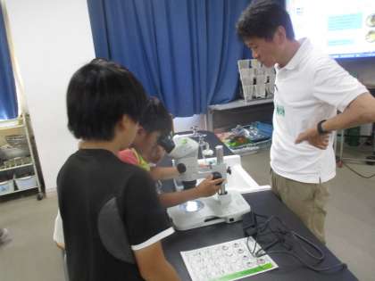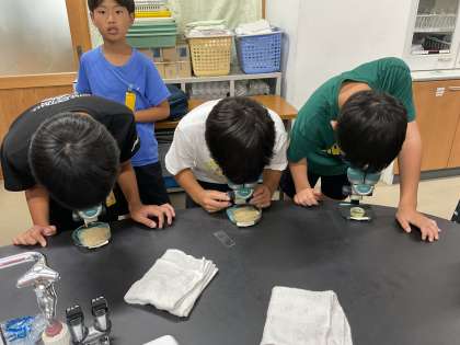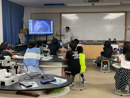 今日は、京都大学の木下先生に来ていただき、メダカの授業をしていただきました。メダカの生命の誕生から卵が育つ様子までを説明してもらった後、卵の様子を観察しました。「産まれて4日後」「産まれて6日後」など少しずつ成長する変化を実際に顕微鏡で見て様子を比べました。子どもたちはとても楽しんで授業を受けていました。