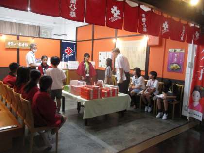 井筒八つ橋本舗では、観光に来たお客さんを想定して、接客業務を行いました。「語先後礼」を合言葉にお客さんに誠意が伝わるように接客をしました。「どこからいらっしゃったんですか。」と間にコミュニケーションを挟みながら接客。応対をしていました。