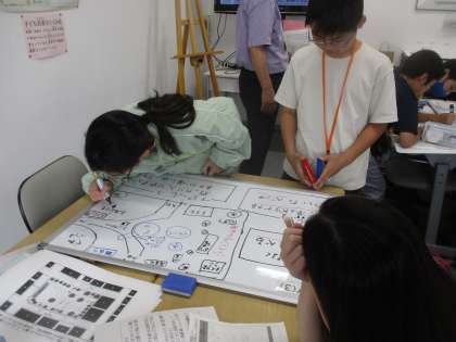 市役所では、市民みんながつかいやすい公園を考えました。市民からの要望を聞いて、「花壇があるほうがいいのではないか。」「ボールで遊べるスペースを区切って作れるといいな。」「トイレはきれいで、ゴミがないほうがみんなに使ってもらえるのではないか。」などたくさん話し合って、考えていました。遊具やトイレの配置までも自分たちで考え、市民の声に寄り添った公園が完成していました。