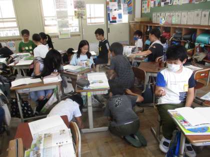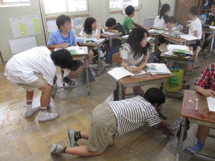 社会科では、「米づくりのさかんな地域」の学習を進めています。今日はほ場整備の学習をしました。実際に机が散乱した教室で田植えに見かけた雑巾がけを行った後に、机が整頓された場所で雑巾がけを行い、整備された良さを考えました。最後はモップを使って機械化や作業時間の短縮のことについて考え、生産者の工夫や努力に目を向けました。