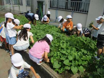 2年生が育てているミニトマトやサツマイモのまわりにある草を引きました。