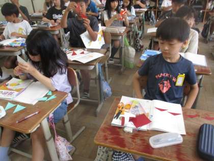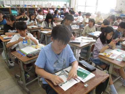 算数科では、「合同な図形」の学習を進めています。今日は、三角形の角度の大きさの和を確かめました。実際に折り紙で三角形を作って敷き詰めたり、3つの角に切って並べたりしました。三角形はどんな三角形であっても3つの角度の大きさの和は180度になることが分かりました。