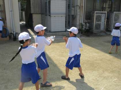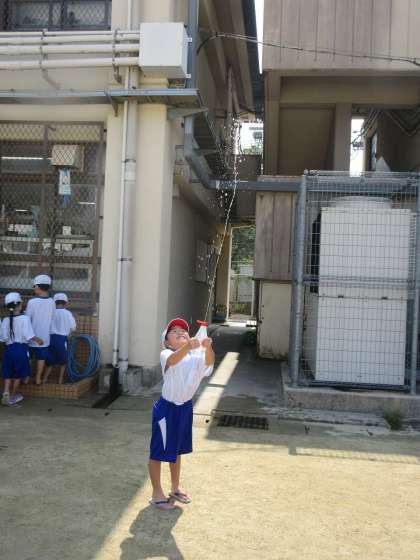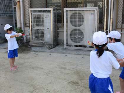 生活科では、マヨネーズやカップ等の容器を使い、水遊びを楽しみました。地面にお絵描 きしたり、掛け合いっこをしたり。空に向かって、どこまで飛ぶか試していた子もいました。思い思いに楽しむ時間にすることが出来ました。